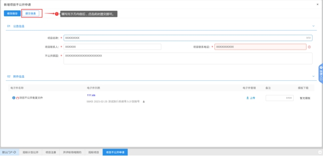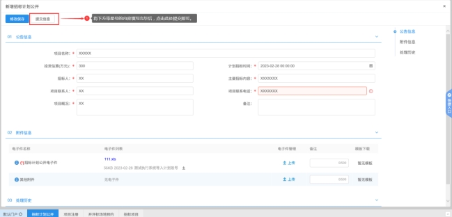 進入后按照要求內(nèi)容填寫完畢(招標計劃公開電子件上傳需加蓋招標人公章),點擊左上角提交按鈕后,待市交易中心受理科審核完畢即可。