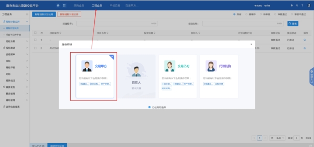 跳轉(zhuǎn)南充市公共資源交易平臺后選擇“交易甲方”身份進入“工程業(yè)務(wù)”模塊(第一次登錄需選擇),如下圖所示: