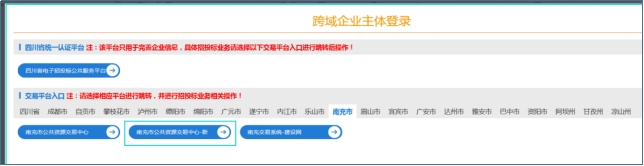 登錄完成后進入首頁,選擇“南充市”→“南充市公共資源交易中心-新”進入系統(tǒng),如下圖所示: