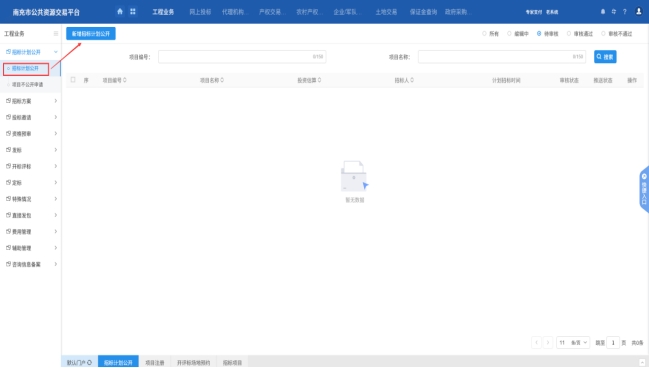 對于需要招標計劃發(fā)布的項目,進入工程業(yè)務(wù)后先選擇左側(cè)“招標計劃公開”然后點擊上方的“新增招標計劃公開”。