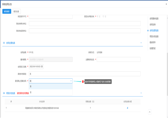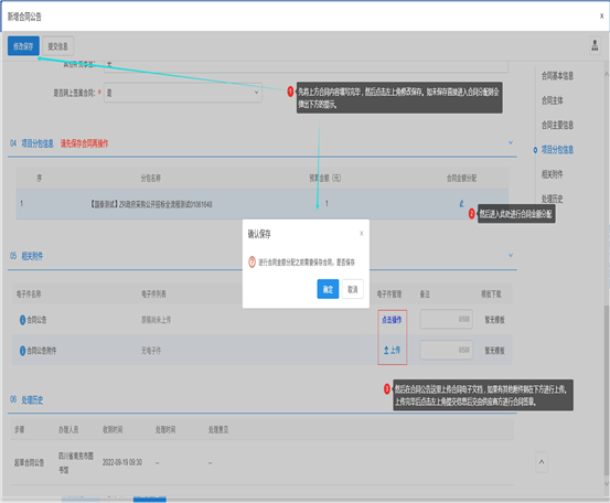 點擊新增在線合同后會進入到合同公告編輯頁面,首先將上方的合同內(nèi)容填寫完畢,然后在附件信息中上傳合同電子件,上傳后需將電子件轉(zhuǎn)換成pdf(無需簽章)。然后點擊左上角提交備案將流程提交至中標人方。