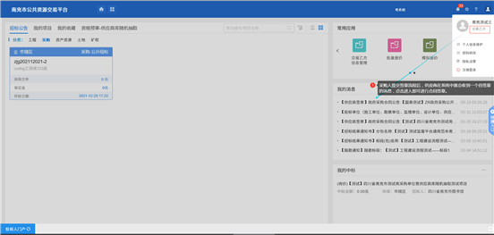 登錄完成后進入首頁,選擇(南充市公共資源交易中心-新)進入系統(tǒng),如下圖: