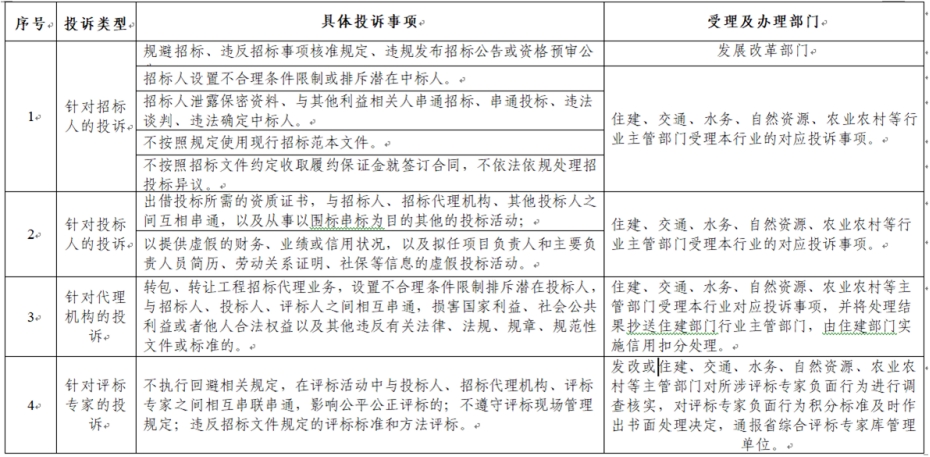 各招投標(biāo)行政監(jiān)督部門(mén)按照職能職責(zé)分工受理投標(biāo)人及其他利害相關(guān)人提出的招投標(biāo)投訴。對(duì)不屬于本部門(mén)受理事項(xiàng),應(yīng)明確告知投訴人應(yīng)該受理的行政監(jiān)督部門(mén)名稱;如先期向工程招投標(biāo)牽頭部門(mén)提出投訴,牽頭部門(mén)可先行受理并依法依規(guī)予以轉(zhuǎn)交轉(zhuǎn)辦。受理部門(mén)根據(jù)調(diào)查和取證情況,對(duì)投訴事項(xiàng)進(jìn)行審查,按照下列規(guī)定做出處理決定: