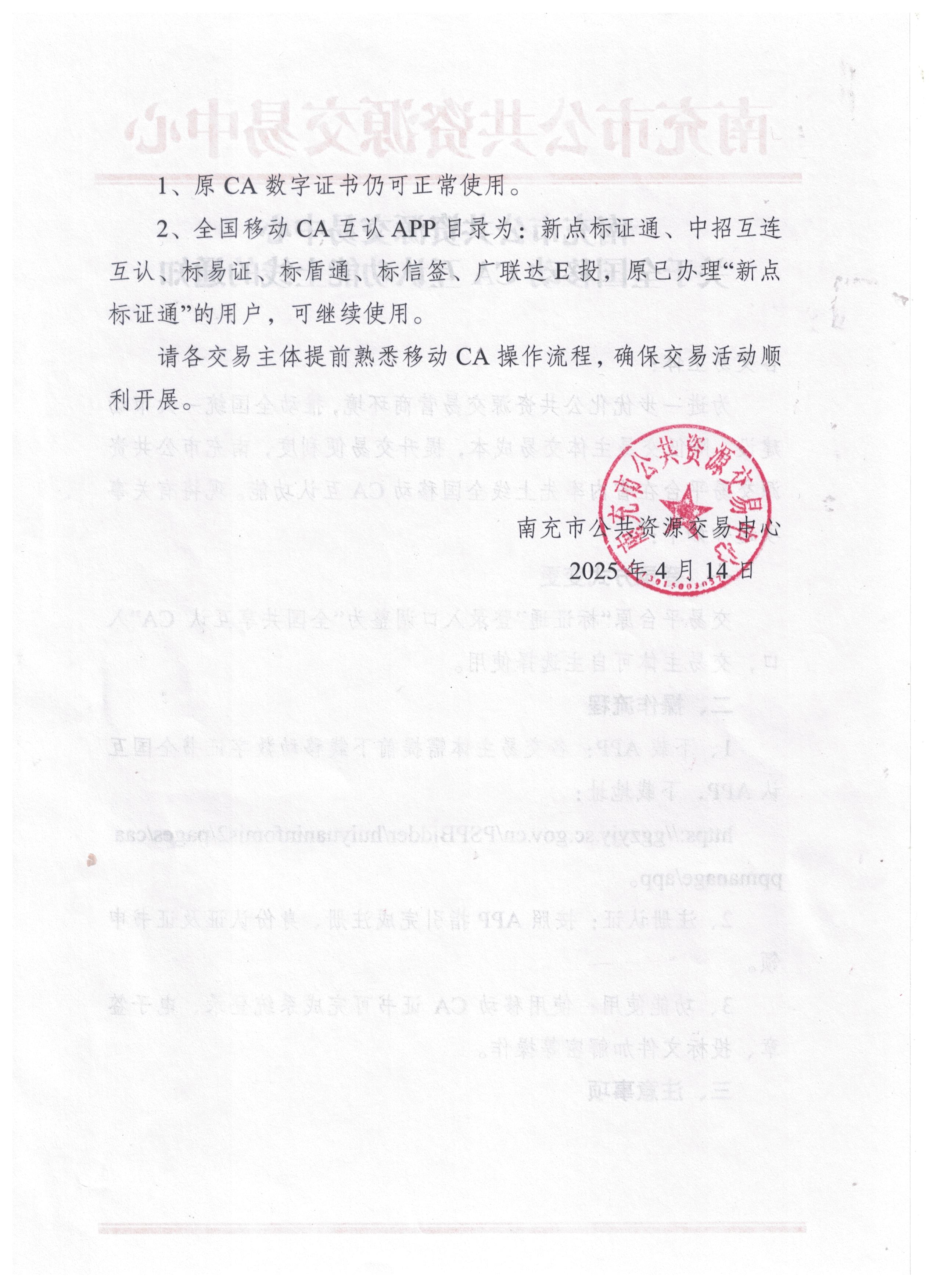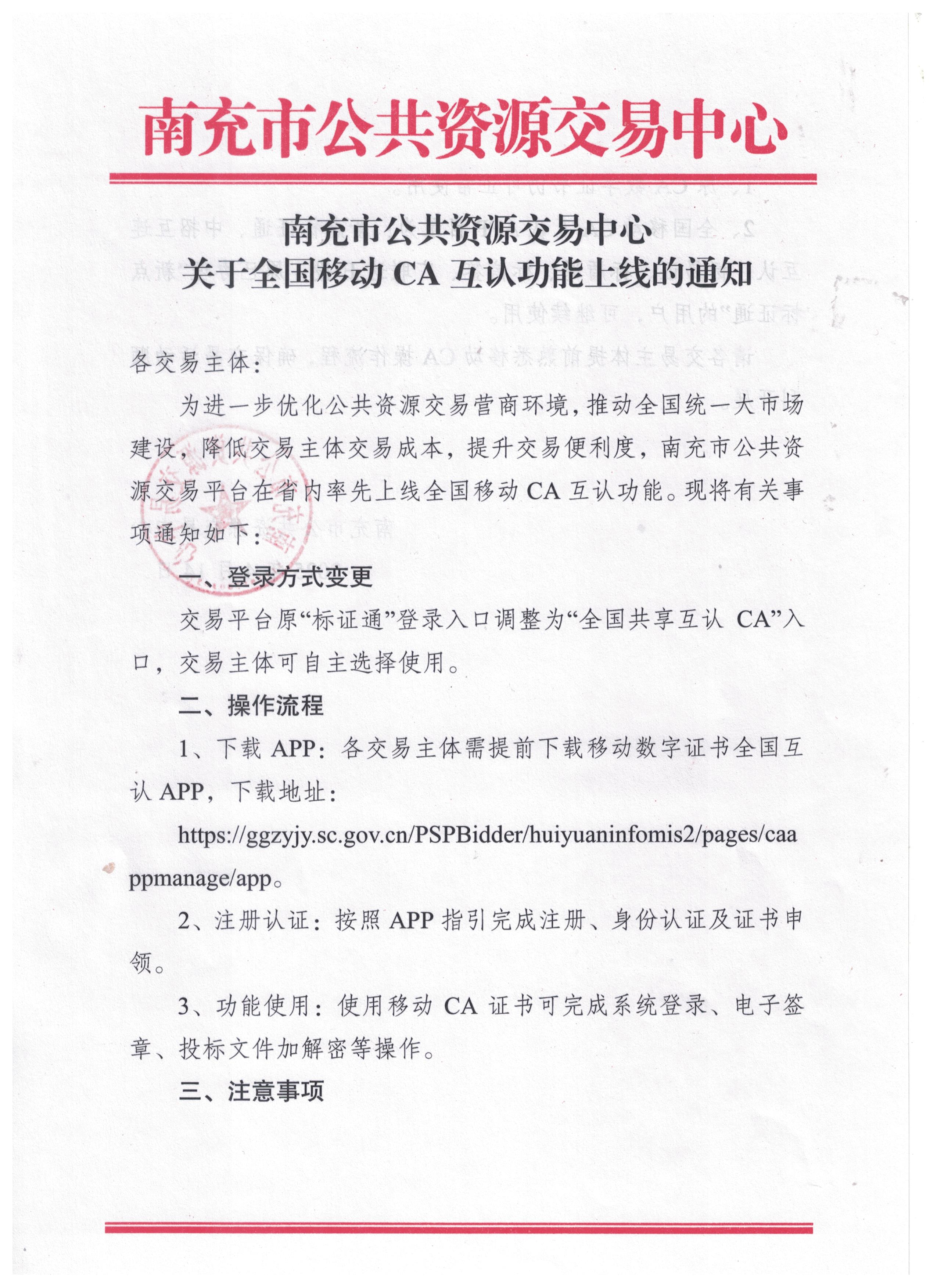 為進(jìn)一步優(yōu)化公共資源交易營商環(huán)境,推動全國統(tǒng)一大市場建設(shè),降低交易主體交易成本,提升交易便利度,南充市公共資源交易平臺在省內(nèi)率先上線全國移動CA互認(rèn)功能?,F(xiàn)將有關(guān)事項通知如下: